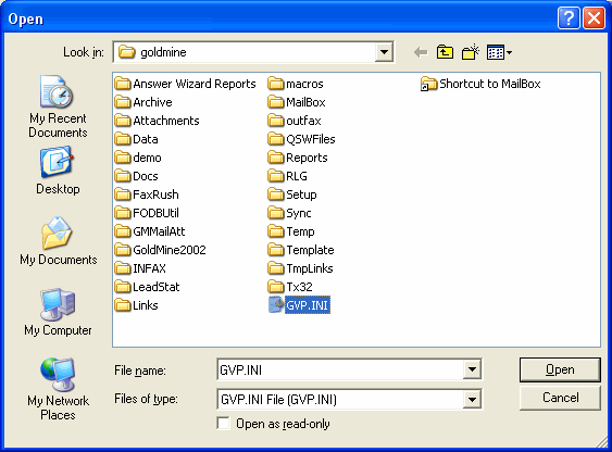 When the browse window displays, browse to the GVP.INI file and click Open. (Note - GVP.INI file is usually in the GoldMine® system directory)