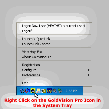 Access the Master Control Program by performing a right-mouse-click when pointer is over the GoldVisionPro icon in the System Tray.